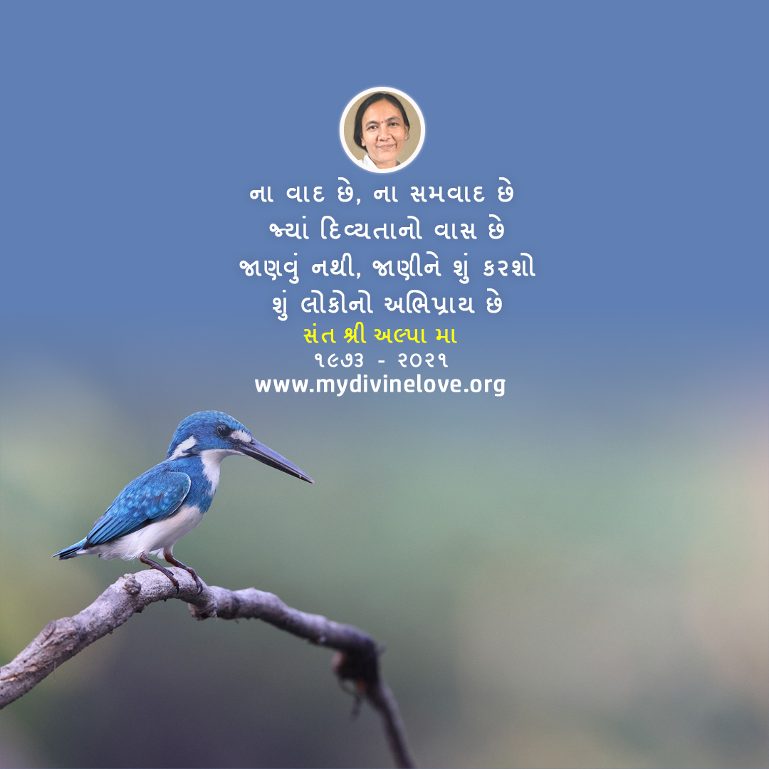 Share ના વાદ છે, ના સમવાદ છે જ્યાં દિવ્યતાનો વાસ છે જાણવું નથી, જાણીને શું કરશો શું લોકોનો અભિપ્રાય છેThere is no talk or dialogue where the divine resides. Don’t want to know; what is the point of knowing what people think. - સંત શ્રી અલ્પા મા Previous સનાતન સત્ય છે, જે ક્યારેય બદલાતું નથી, જે સદૈવ છે Next ના માનવું હોય તો ના માનજો
