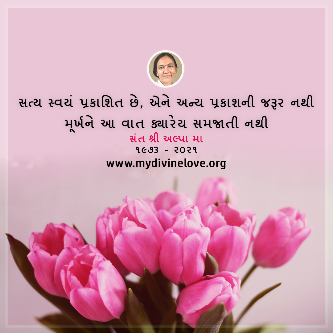 Share સત્ય સ્વયં પ્રકાશિત છે, એને અન્ય પ્રકાશની જરૂર નથી મૂર્ખને આ વાત ક્યારેય સમજાતી નથીTruth is self illuminating, it does not need any other light. A fool never understands this. - સંત શ્રી અલ્પા મા Previous એ સિદ્ધિ કે પ્રસિદ્ધિ શા કામની, જે નિજરૂપનાં દર્શન ના કરાવે Next હું કોઈ આકાર નથી, તું મને આકારમાં બાંધ નહીં